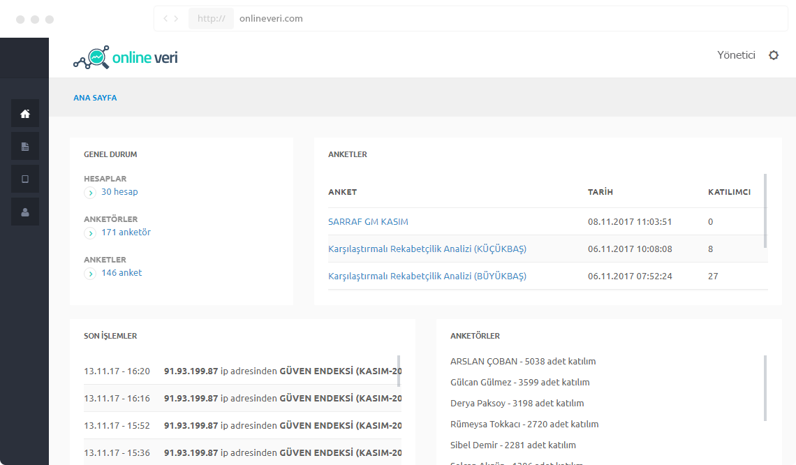 Online Veri; araştırma firmaları ve akademisyenlerin ihtiyaçları doğrultusunda oluşturulmuş anket, analiz ve raporlama sistemidir. Araştırma verilerinin kağıt üzerinde toplanması ve bilgisayara girilmesi işlemlerini ortadan kaldıran Online Veri, mobil uygulama üzerinden çevrimdışı olarak toplanan bilgilerin online ortama aktarılması prensibiyle veya doğrudan online ortamda çözülen anketler üzerinden çalışır. Anket çözüm süresinden anketör konumlarına ve arkaplan ses kayıtlarına kadar birçok bilgiyi otomatik olarak toplar. Toplanan veri üzerinden çaprazlama ve oransal değişiklik gibi fonksiyonlar sunarak analiz işlemlerinizi kolaylaştırır.