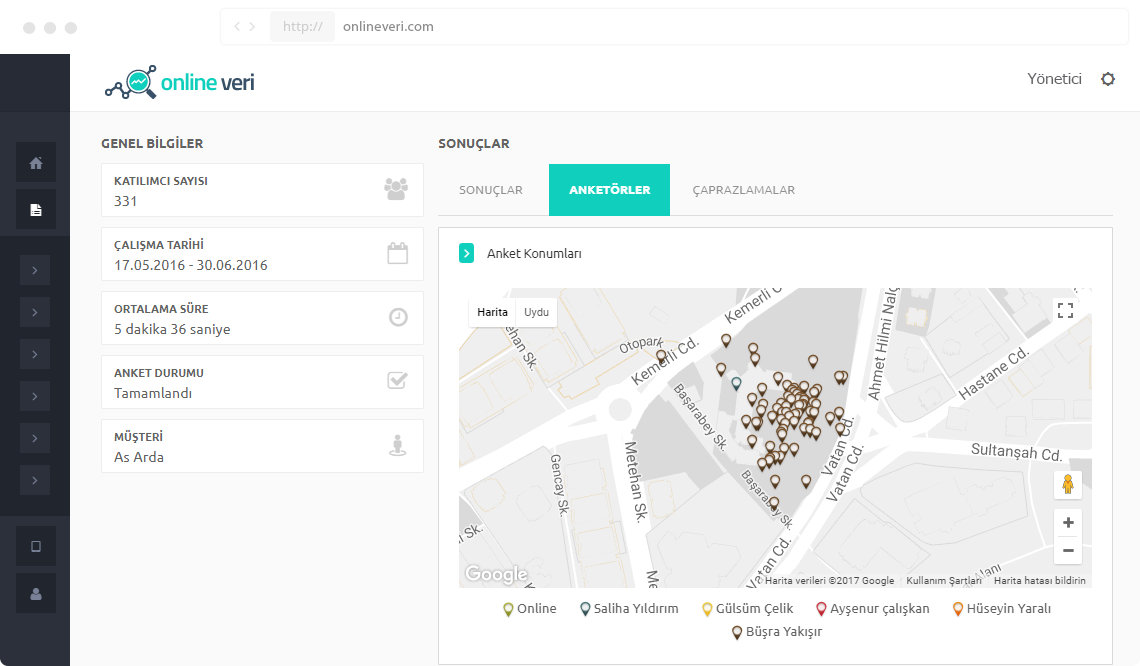 Hangi anketörün kaç anket yaptığı, anketi yaptığı süre ve konumu kolaylıkla görüntülenebilir.