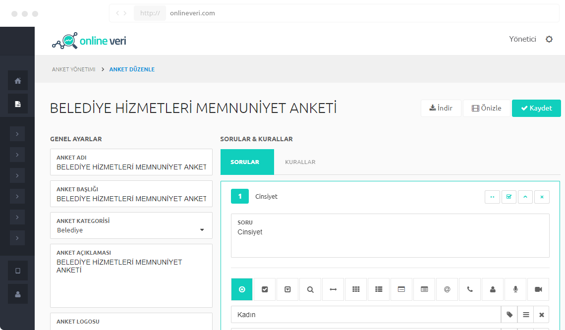 Sorular tanımlanıp önizlenebilir, kurallar oluşturulabilir, anket tarihi, hedeflenen katılımcı sayısı, firma ve logo bilgileri girilebilir.