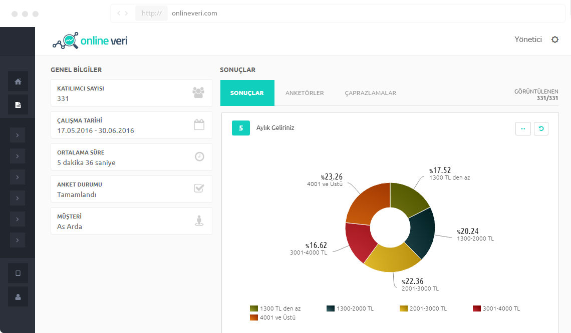 Online Veri; araştırma firmaları ve akademisyenlerin ihtiyaçları doğrultusunda oluşturulmuş anket, analiz ve raporlama sistemidir. Araştırma verilerinin kağıt üzerinde toplanması ve bilgisayara girilmesi işlemlerini ortadan kaldıran Online Veri, mobil uygulama üzerinden çevrimdışı olarak toplanan bilgilerin online ortama aktarılması prensibiyle veya doğrudan online ortamda çözülen anketler üzerinden çalışır. Anket çözüm süresinden anketör konumlarına ve arkaplan ses kayıtlarına kadar birçok bilgiyi otomatik olarak toplar. Toplanan veri üzerinden çaprazlama ve oransal değişiklik gibi fonksiyonlar sunarak analiz işlemlerinizi kolaylaştırır.
